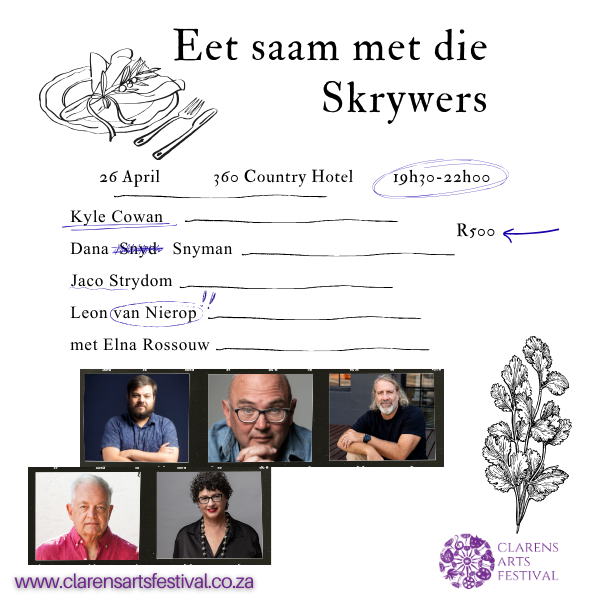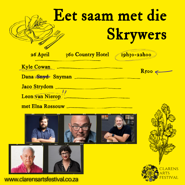 Geniet ‘n intieme aandete by die 360 Country Hotel saam met vier van die fees se ster-skrywers. Sluit aan by KYLE COWAN, DANA SNYMAN, JACO STRYDOM & LEON VAN NIEROP. ELNA ROSSOUW speel gasvrou.