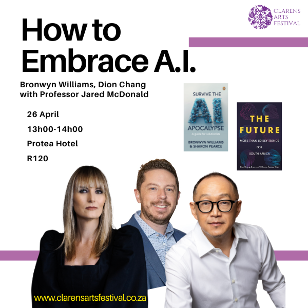 Trend forecasters BRONWYN WILLIAMS (Survive the AI Apocalypse) and DION CHANG (The Future - More Than 80 Key Trends for South Africa) outline the impact of AI on our world and how to turn it into an asset.