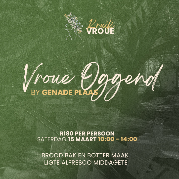 Kom geniet 'n heerlike oggend by Genade Plaas, waar ons die kuns van brood bak en botter maak verken. Hierdie spesiale geleentheid beloof om 'n gesellige en leersame ervaring te wees, omring deur die rustigheid van die plaaslewe.