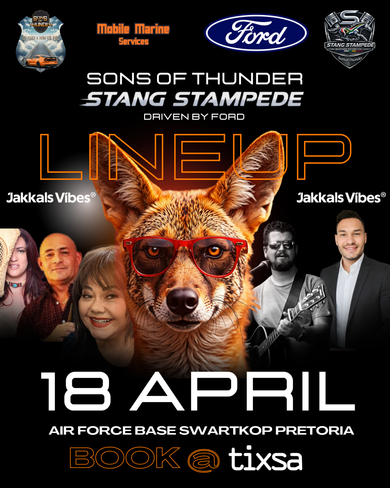 Public Entry at SAAF museum Sons of Thunder Stang Stampede Driven by Ford: to view the Ford Mustangs and music performances by Jakkals Vibes, Dylan Tori, Abe, Lizz Meiring and Thys + more