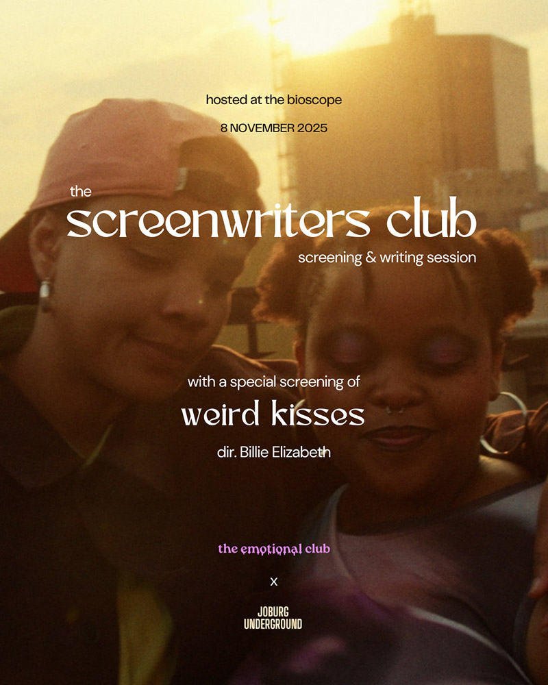The club welcomes all kinds of writers and identities, although our main aim is building community and a network among women and queer screenwriters.All participants should have some basic knowledge of screenwriting as this is not a screenwriting course. This screening is cohosted with Joburg Underground (@jhb_under):